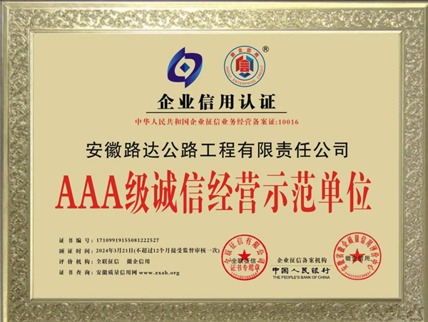 近日,經(jīng)全聯(lián)征信有限公司、安徽省徽企質(zhì)量信用評價(jià)中心聯(lián)合認(rèn)證,路達(dá)公司獲評“AAA級誠信經(jīng)營示范單位”。