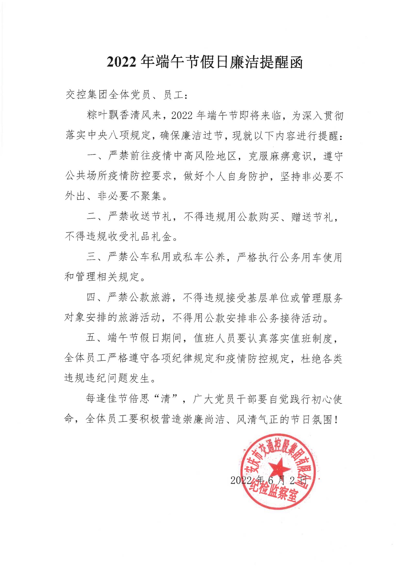 2022年端午節(jié)假日廉潔提醒函