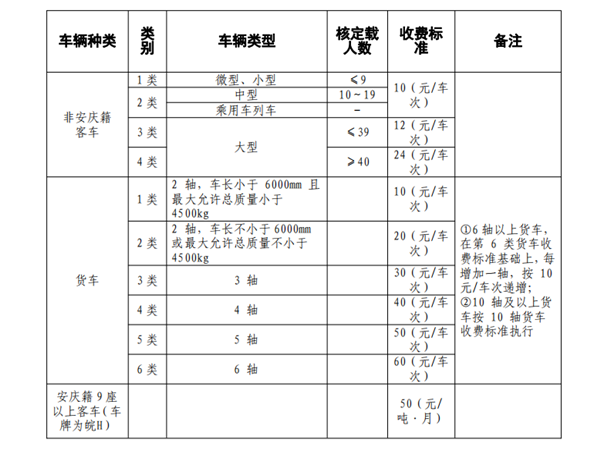 車輛收費標準按照省交通運輸廳、省物價局《關(guān)于調(diào)整我省路橋通行費收費標準的通知》(皖交財〔2010〕391號),省交通運輸廳、省發(fā)展改革委、省財政廳《關(guān)于印發(fā)安徽省收費公路車輛通行費計費方式調(diào)整方案的通知》(皖交路〔2019〕144號)等文件執(zhí)行。持有安徽交通支付卡(ETC)的車輛,根據(jù)省交通運輸廳、省發(fā)展改革委《關(guān)于落實收費公路ETC車輛通行費優(yōu)惠政策的通知》(皖交運〔2019〕204號)規(guī)定,客車給予95折優(yōu)惠,貨車給予85折優(yōu)惠。外省ETC用戶給予95折優(yōu)惠。具體見下表: