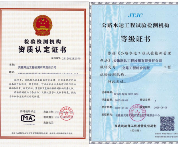 近日,安徽路達(dá)工程檢測(cè)有限責(zé)任公司成功獲批檢驗(yàn)檢測(cè)機(jī)構(gòu)資質(zhì)認(rèn)定和公路水運(yùn)檢測(cè)綜合丙級(jí)兩項(xiàng)資質(zhì)證書(shū),這標(biāo)志著檢測(cè)公司已具備相關(guān)法規(guī)和行業(yè)主管部門(mén)規(guī)定的基本檢測(cè)條件和能力,可以正式向社會(huì)出具具有法律效力的檢驗(yàn)檢測(cè)報(bào)告。